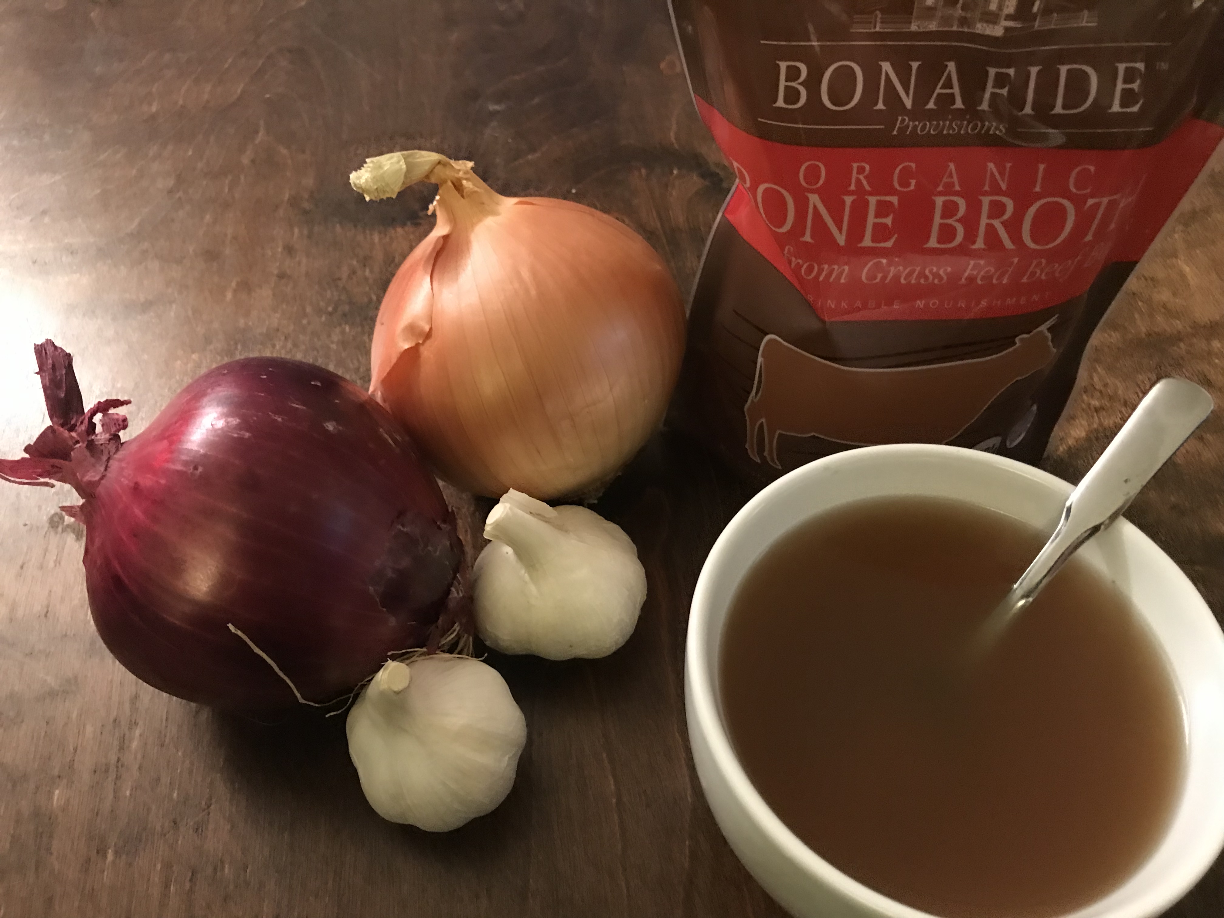 Unfortunately, as a college student, I rarely have the time or energy to put into deboning an animal and preparing a truly traditional bone broth. This is where I generally head to my local health food store in the hopes that someone has already done the work for me and stocked the shelves with a selection of responsibly sourced options. If you don’t live in some kind of “holler” with banjo music eerily echoing overhead there should be a decent selection at your local market or health food store. My personal favorite is Bonafide brand bone broth. Their ingredients list is short – and more importantly, pronounceable, and the flavor and quality beats anything else I’ve tried in recent memory. Now this being said, up until a few months ago, every preparation of bone broth that I tried, whether it was store-bought or I made it myself, always seemed to end up tasting bland and leaving me feeling more than a little underwhelmed. Finally, after asking around to confirm that other people were in fact having the same issue and that I wasn’t altogether losing my sense of taste, I started to really sock the salt and herbs to my mineral rich mid-morning pick-me-up. The change was drastic and immediate. Not only did this once bland concoction taste incredible, but I was actually looking forward to my daily dose; and what’s more important, each cup I finished left me feeling amazing. It took a little while to strike upon a good general formula, but eventually I found that some sautéed garlic and onion, a surprising amount of salt, and a few common herbs and spices made for a good base for adding flavor and nutritive value.